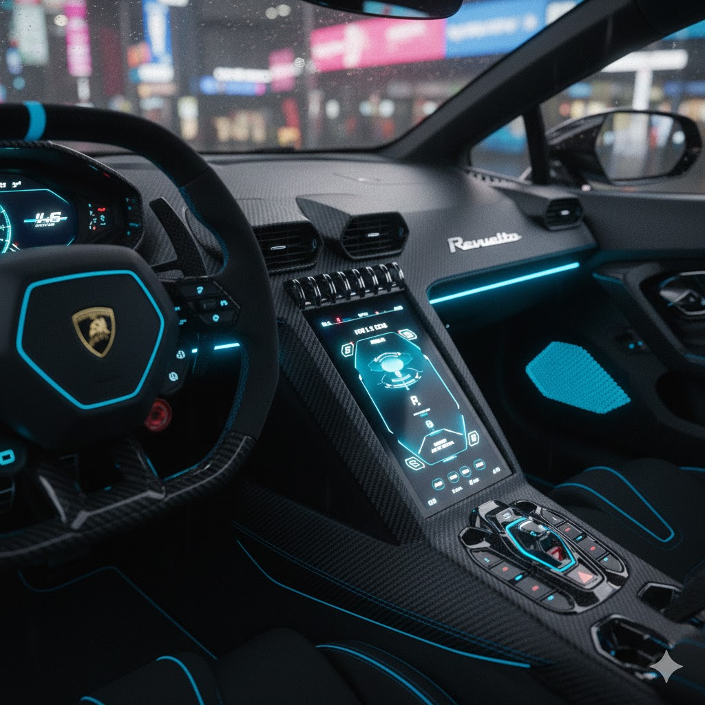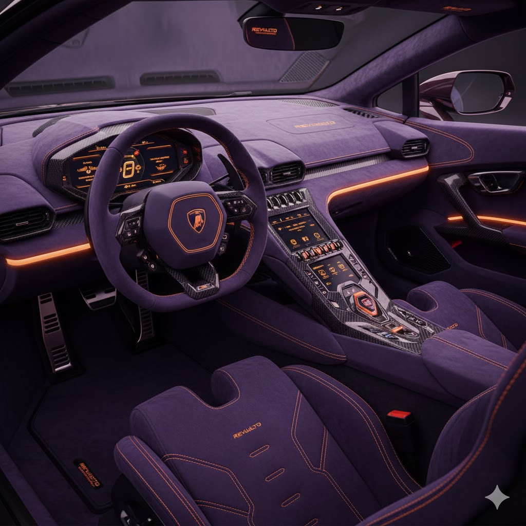 Interior Revuelto terasa seperti kokpit pesawat tempur. Dashboard digital, layar sentral, dan kontrol terintegrasi menciptakan pengalaman mengemudi yang imersif.